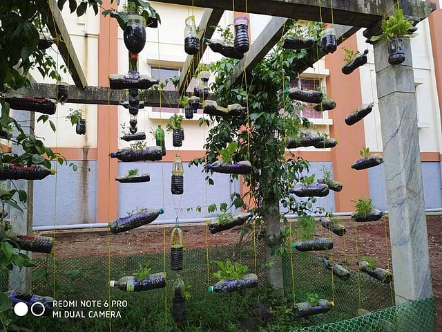 “This initiative wouldn’t have been a success without the contribution of my students. In the beginning, I divided them into groups and assigned them each a spot to do this ‘plastic bottle gardening’. Since we were doing it for the first time, we were not sure of what particular vegetables can be grown in it. Gradually, we understood that we could grow green leafy vegetables, onion, radish and garlic. Bottles have to be cut in a horizontal shape to grow greens like spinach, coriander, Amaranthus. For vegetables like the radish that grows along with roots, the bottle has to be cut vertically. Similarly, all plastic bottles cannot be used to grow vegetables. Some bottle materials are very thin and they cannot hold the weight. Hence it is better to use plastic bottles which are very hard and are suitable to hold the weight," he adds.