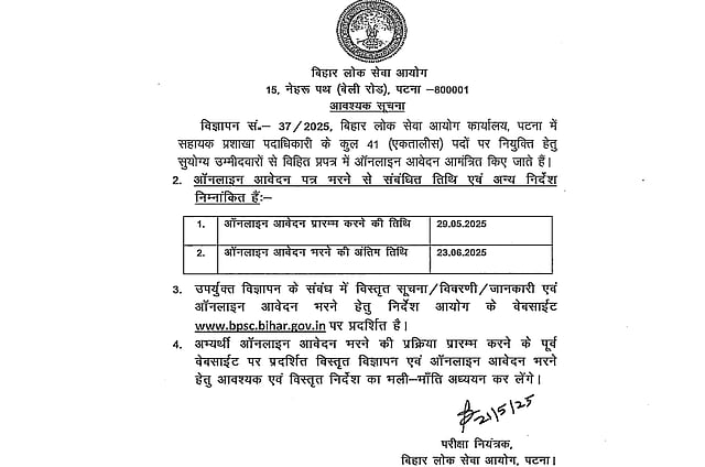 The state commission will be accepting applications for 41 Assistant Section Officer vacancies starting May 29, 2025. Interested candidates have nearly a month to complete their applications, with the final submission deadline set for June 23. All applications must be submitted through BPSC's official web portal, according to a report by NDTV Education.