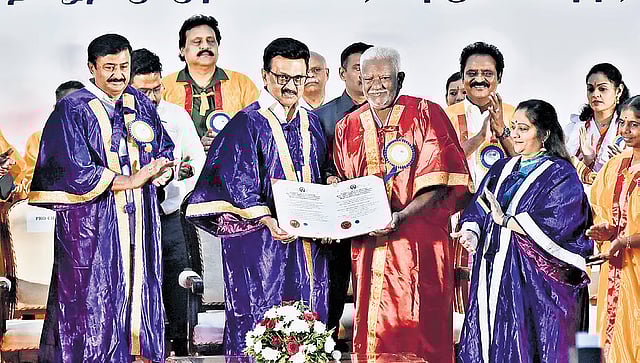 At the ceremony, honorary doctorates were conferred on artiste Chandru and actor Sivakumar. Stalin, who is the chancellor of the university, also unveiled a series of academic and institutional initiatives aimed at strengthening music and fine arts education in the state.