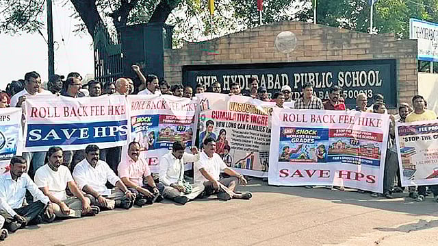 HYDERABAD: Tensions escalated at Hyderabad Public School (HPS), Ramanthapur, on Friday as parents staged protests against steep fee hikes imposed by private schools, alleging financial strain and a lack of transparency in fee structures.