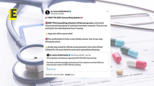 Dr Suvrankar Datta, President, Federation of All India Medical Association (FAIMA) took to social media platform X, on October 26, to announce that the schedule for the National Eligibility-cum-Entrance Test for Postgraduate (NEET-PG) counselling will be released soon and that "recent issues preventing release of schedule have been resolved".