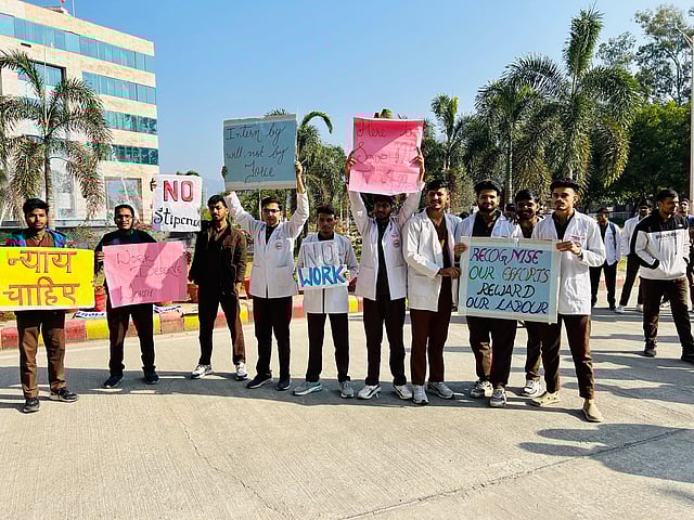 The demonstrators, clad in white coats, carried signs reading “Recognize Our Efforts, Reward Our Labour”, “Work Deserves Worth,” and “Intern By Will, Not By Force” among others. They also proclaimed slogans such as “No Stipend, No Work” and “Justice for AHS”.