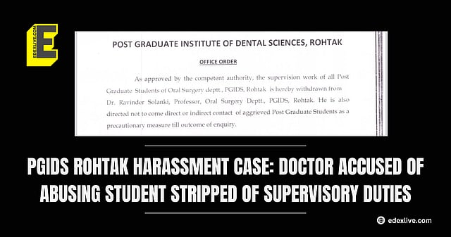An office order from the institute read as such: "As approved by the competent authority, the supervision work of all Post Graduate Students of Oral Surgery deptt., PGIDS Rohtak is hereby withdrawn from Dr Ravinder Solanki, Professor, Oral Surgery Deptt., PGIDS, Rohtak. He is also directed not to come direct or indirect contact of aggrieved Post Graduate Students as a precautionary measure till outcome of enquiry."