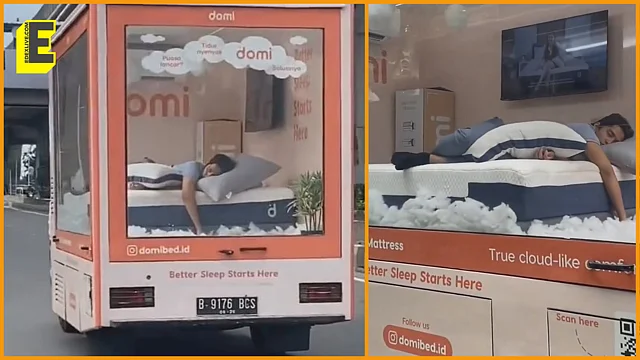 As seen in the video, the display truck is fitted out like a miniature studio apartment, complete with a plush bed, air conditioning, and even a television. A message printed on the vehicle reads, “Better sleep starts here,” promoting what appears to be a cloud hybrid mattress.