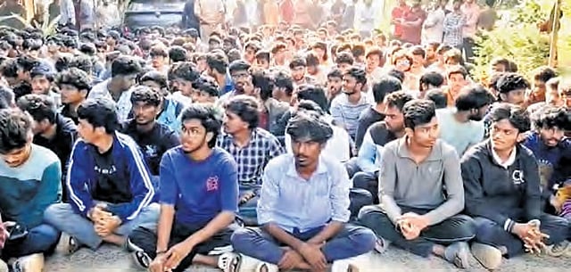Hundreds of students staged a dharna demanding that RGUKT authorities take stern action against the culprits behind Srujan’s suicide.