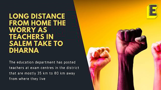 More than 100 teachers staged a dharna on the evening of May 2 before the Chief Educational Officer's (CEO) office at Salem Collectorate, alleging that exam centres allocated to the teachers are long-distance. They said that the Class XII public examinations are starting on May 5 and the education department has posted teachers at exam centres in the district that are mostly 35 km to 80 km away from where they live.