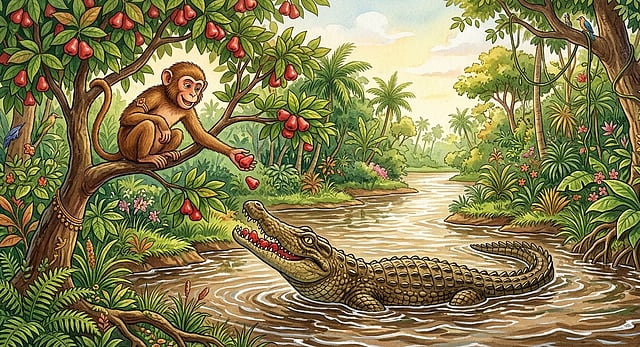 In a lush forest by a river, a clever monkey lived on a tall fig tree laden with sweet fruits. Each day, he befriended a crocodile who swam up to share the juicy figs. The crocodile enjoyed them so much that he carried some home to his wife downstream.
