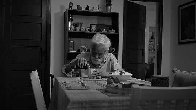 Despite a frail body and mind, he remains caught in a constant struggle to connect the past with the present — and perhaps even the future. The film focuses on his daily routine — him sitting with a cup of coffee deep into contemplation; taking an equally introspective strolls, and again halting by the staircase — lost in his thoughts.