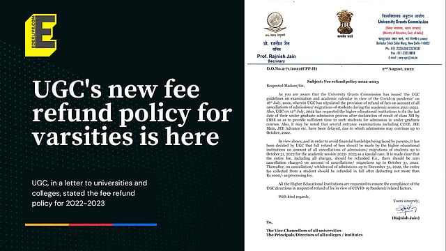 Hence, "in order to avoid financial hardships being faced by parents" UGC said that full refund of fees should be done by higher educational institutions on account of all cancellations of admissions and migrations of students. It can do this up to October 31, 2022 for the academic session 2022-2023 only as a special case.