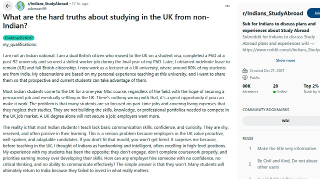 A candid Reddit post from a UK-based lecturer has sparked intense discussion about why many Indian students struggle to find jobs after completing their degrees abroad. Writing on the subreddit r/Indians_StudyAbroad, the user adamsan99 — a dual British citizen and lecturer at a UK university — shared observations drawn from teaching Indian students, who reportedly make up nearly 80% of his classroom.
