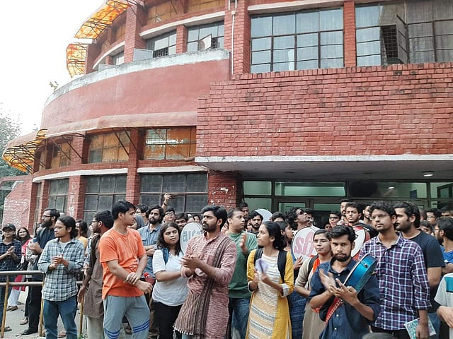 The students of Jawaharlal Nehru University have been protesting to stop the administration from locking their union room for the past two days and are currently on an indefinite sit-in in front of the JNU Students' Union room at the Students' Activity Centre.